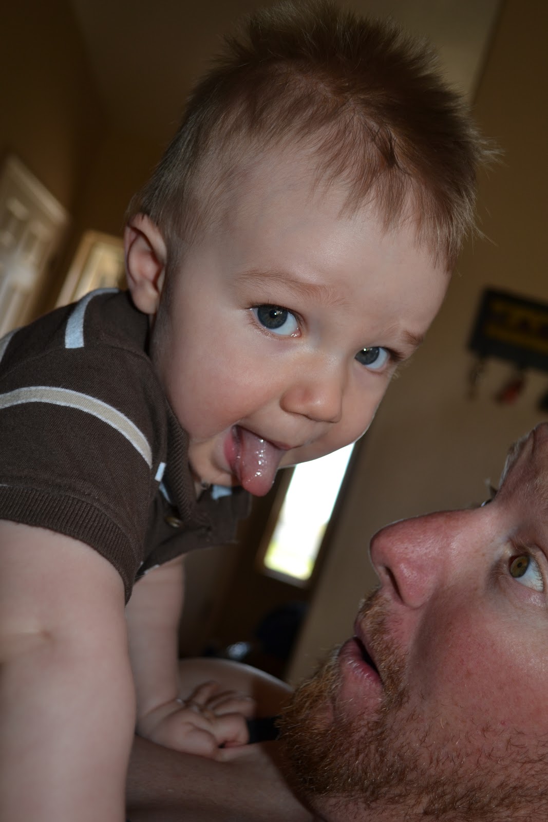 He's a little parrot and when he wants to, will try to repeat everything you say... especially animal noises. However, there are times when he just doesn't want to perform and won't make a peep for you. I love when he's in a chatty mood and will just jabber away like he knows exactly what he's talking about and he'll look at you like you should too! Some of the words that we can understand are: bubbles, Piper (a baby at daycare), grandpa, dad (which he likes to yell while he's in the tub), bobble (bottle), hot, up, off, and of course no.
